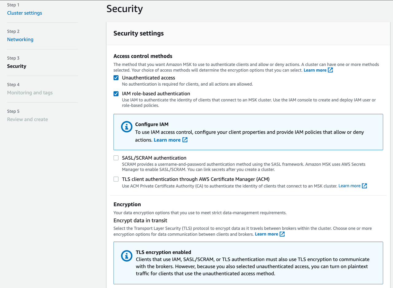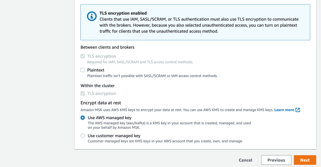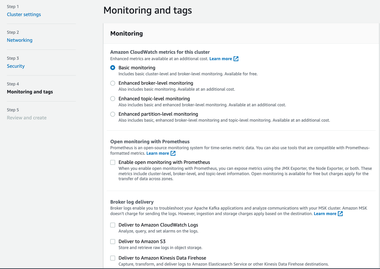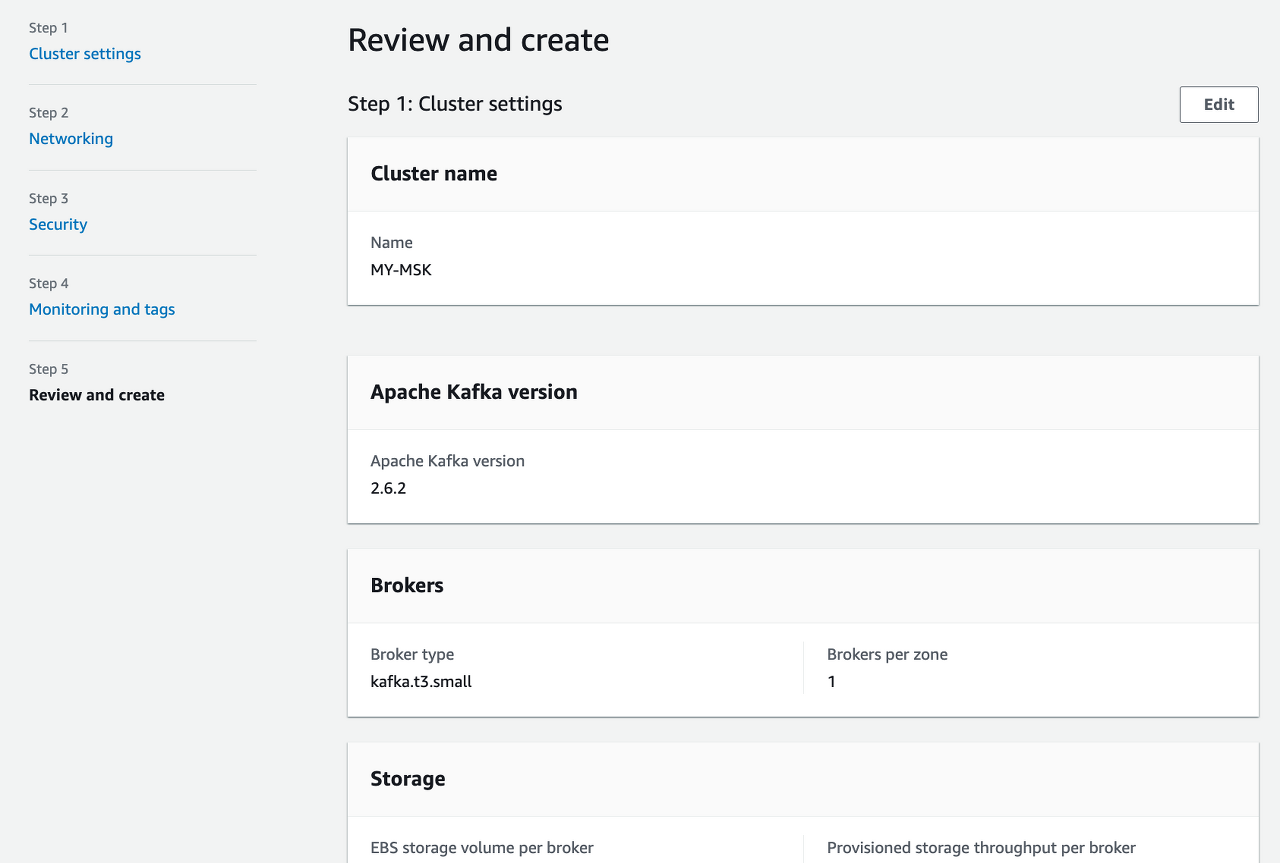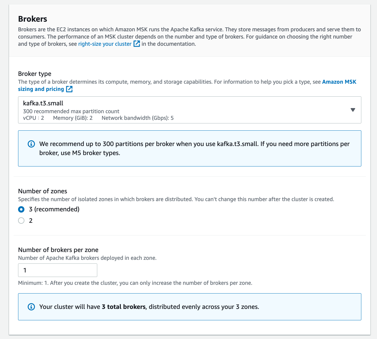 - Number of broker per zone: 존당 브로커 개수를 지정한다. 우리는 존당 1개만 지정했다. (안정적인 서비스를 위해서 1로 지정하는 것이 좋다. )