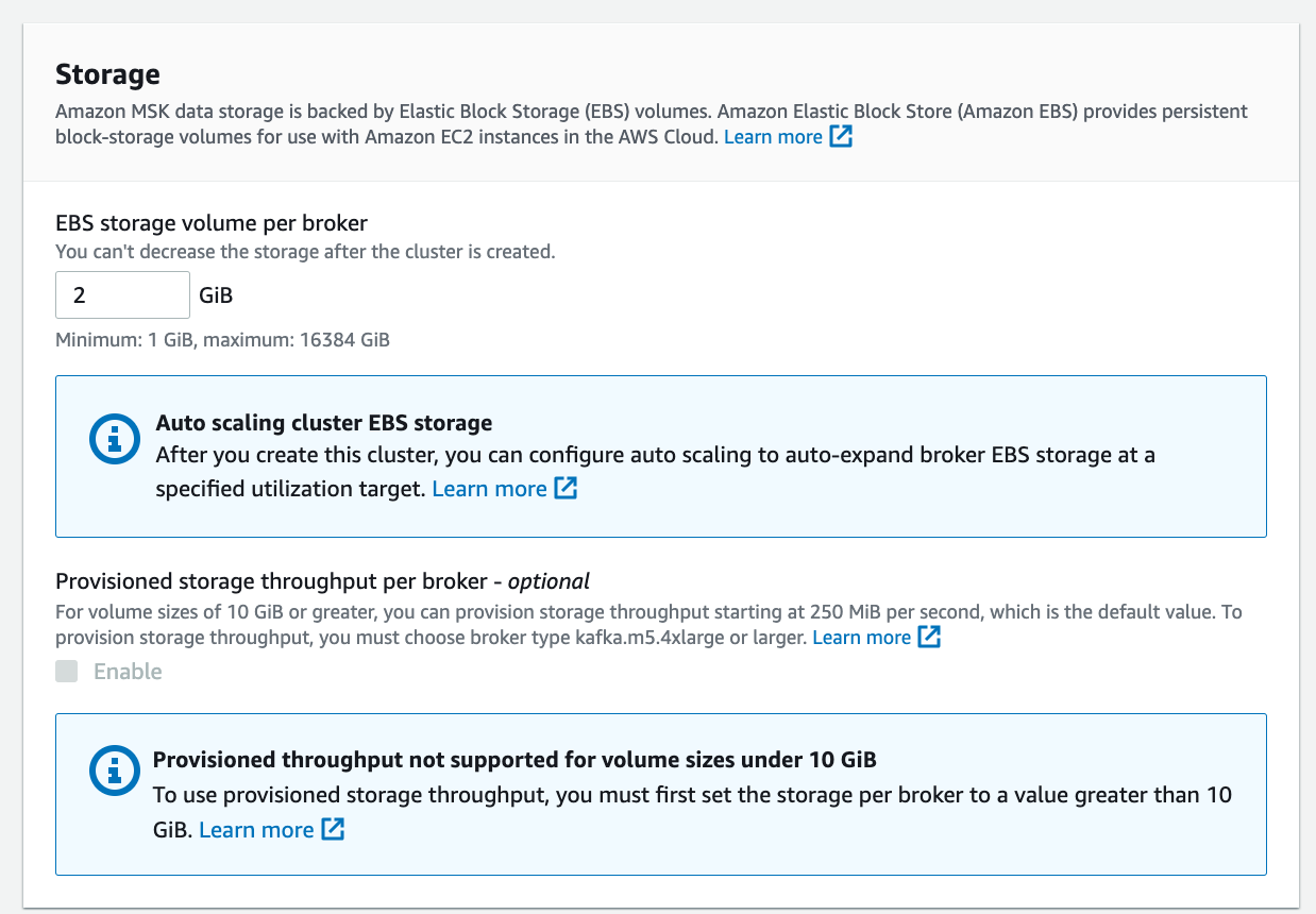 - Storage 는 EBS storage volume per broker 를 2GB로 잡았다.