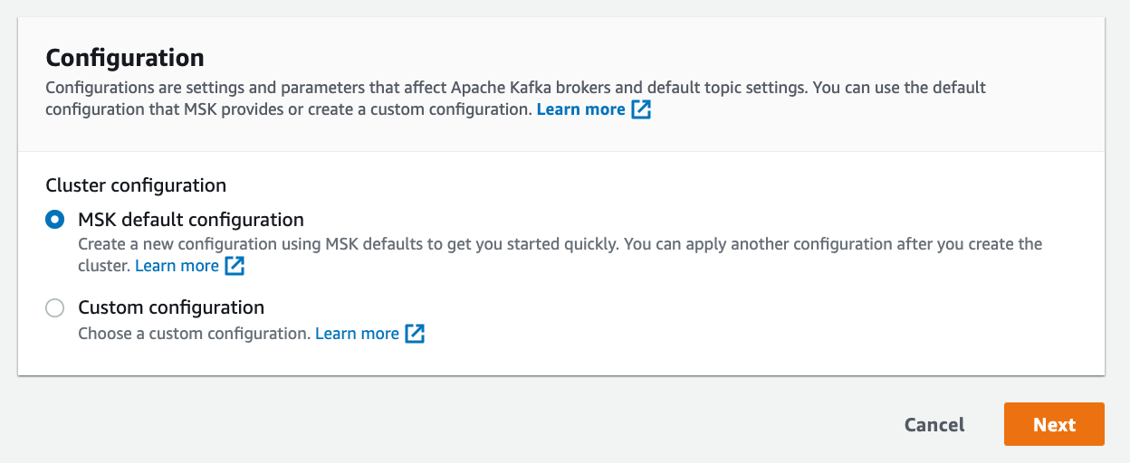 - Configuration은 MSK default configuration 을 선택하여 "Next" 를 지정한다.