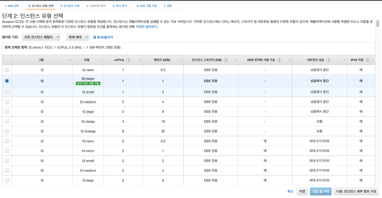 - 테스트 용이므로 t2.micro 로 선택하자.