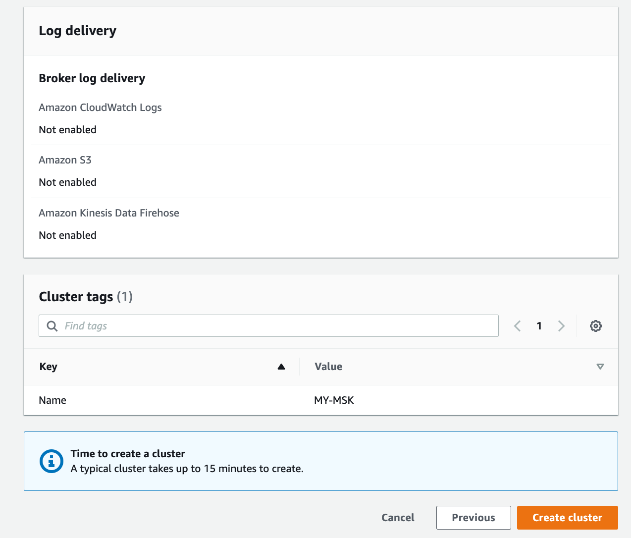 - 모두 작성이 되었다면 리뷰를 하고 "Create cluster"를 선택하고 클러스터를 생성하자.