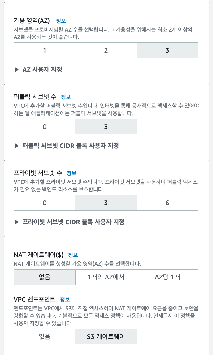 - 3으로 설정했다. 퍼블릭 서브넷을 각 AZ마다 생성하도록 3으로 설정했다.