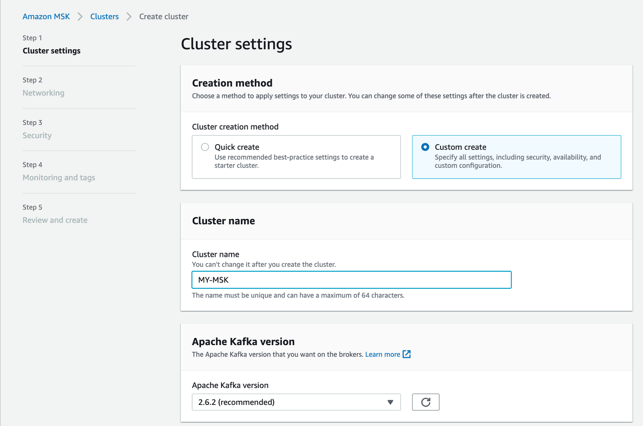 - Apache Kafka version: 을 지정한다. (여기서는 recommended 를 선택한다.)