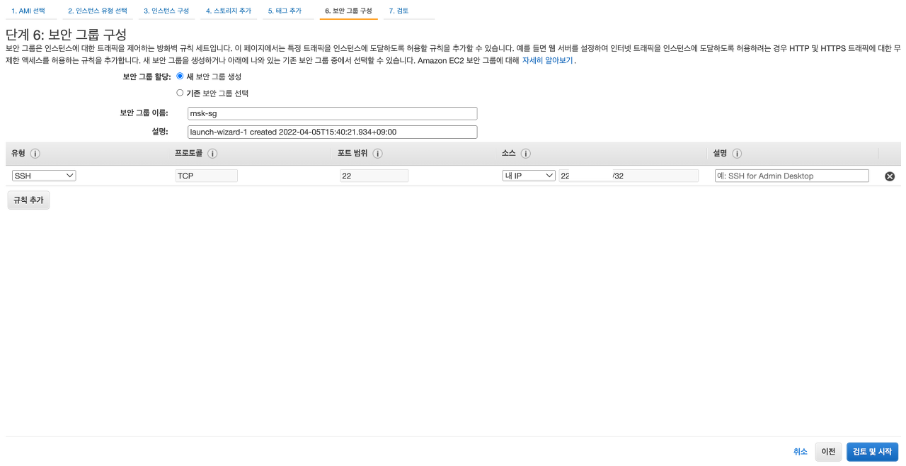 - 신규 보안그룹을 만들고, SSH 접근은 자신의 IP로 지정하여 안전하게 접근할 수 있도록 한다.