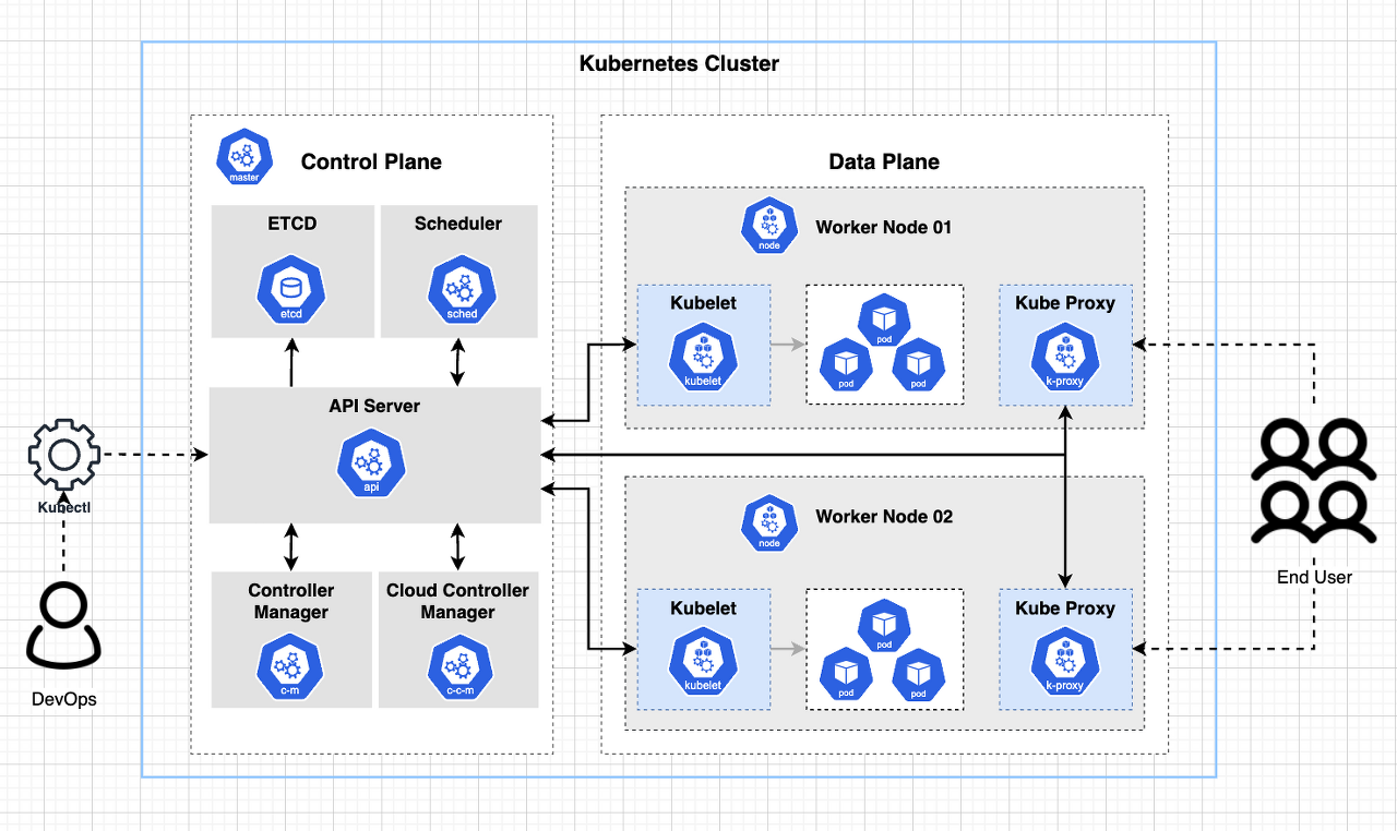 - 마스터 노드는 DevOps로 부터 오퍼레이션 요청을 받아 클러스터를 운영하고, 서비스 Pod등을 운영하게 된다.