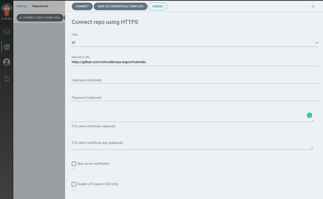 우선 argocd 레 우리가 작성한 디플로이먼트 를 수행하기 위해서는 다음과 같은 리포지토리 등록 절차가 필요하다.