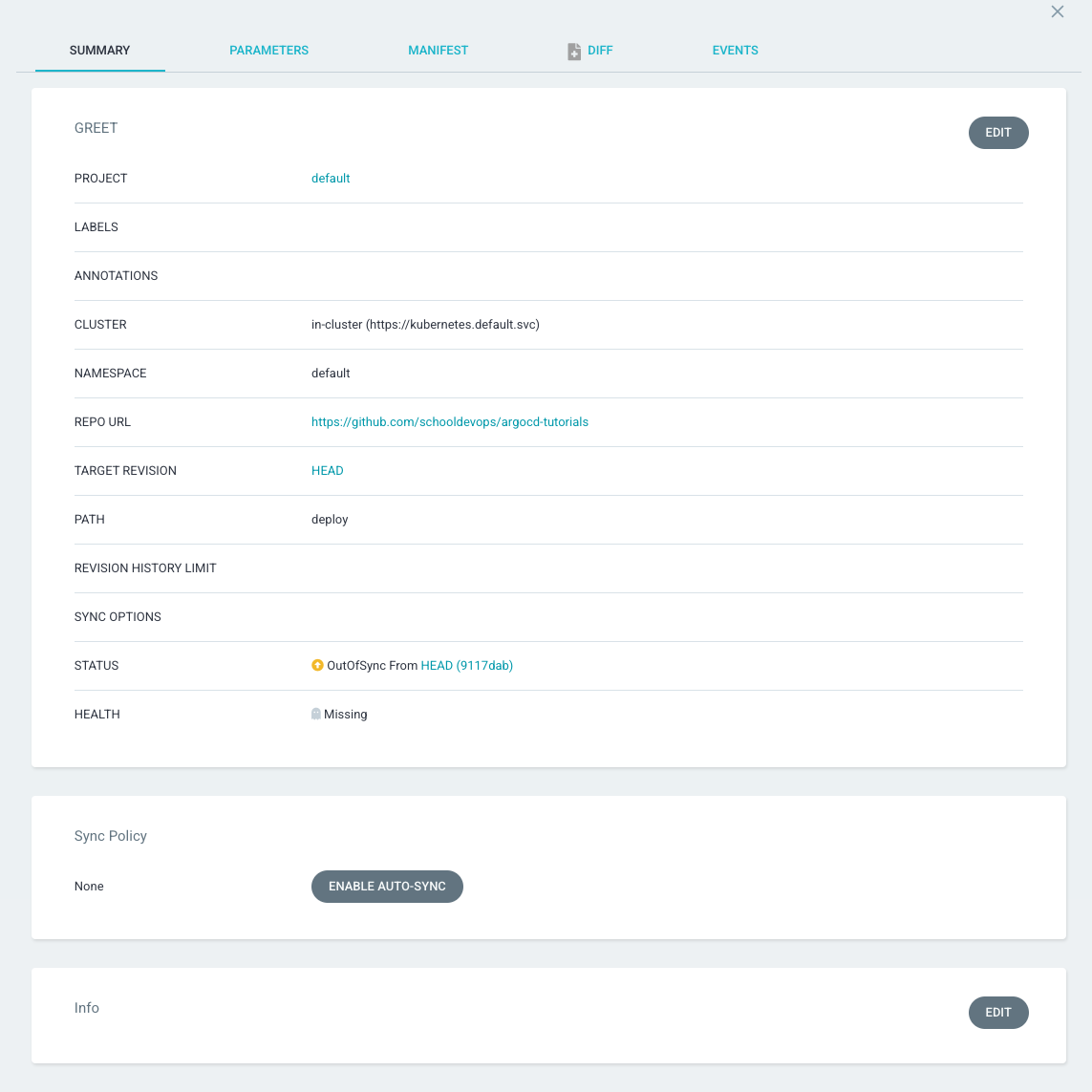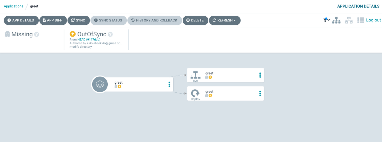 - 현재 상태는 OutOfSync로 주황색 표시가 되어 있음을 알 수 있다.