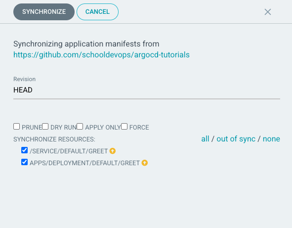 - Manual: git과 kubernetes 의 배포 상태가 다른경우 수동으로 싱크할경우 사용한다.