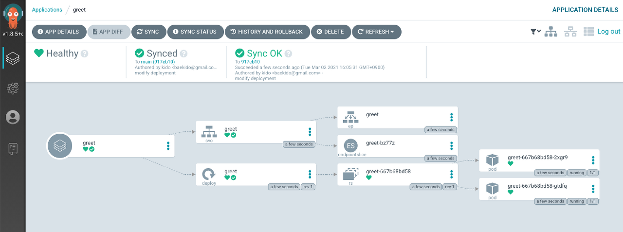 SYNCHRONIZE 를 클릭하여 실제 Kubernetes 에 반영한다.
