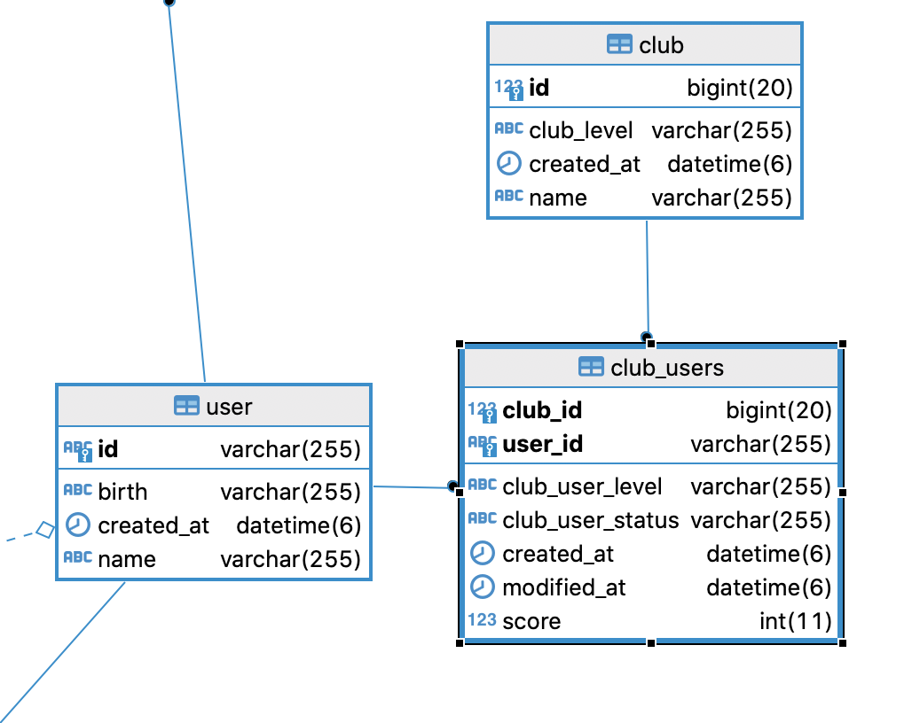 하나는 club의 id와 연관이 생성이 되었고, 다른 하나는 user의 id와 연관이 생성 되었다.