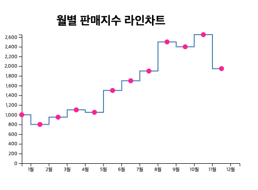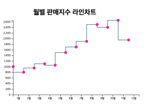 d3.line 메소드를 이용하여 x, y 값을 datum 에서 각각 뽑아내어 할당했습니다. x축은 월, y축은 월별 판매지수 입니다.